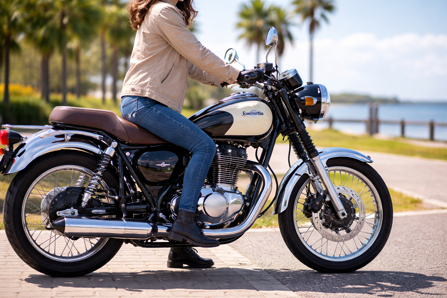 エストレヤはクラシックな車体設計と細身フレームを持つ単気筒モデルです。