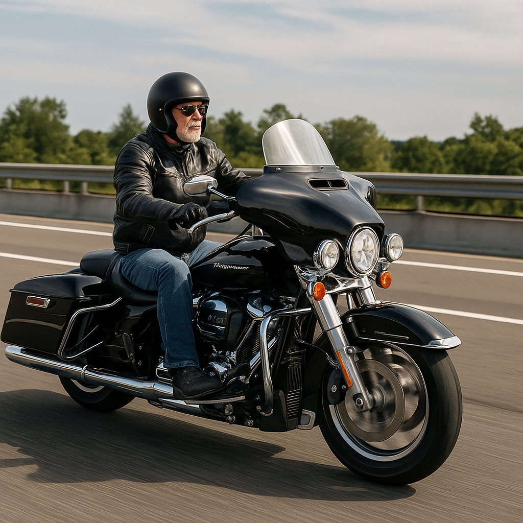 📷 画像例:大型ハーレーで高速道路をクルージングするベテランライダー