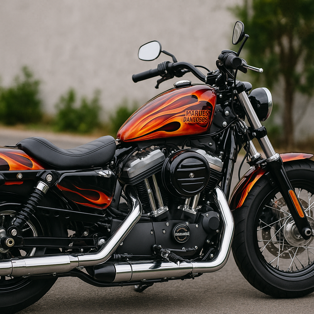 📷 画像例:カスタムペイントが施されたハーレーのサイドショット