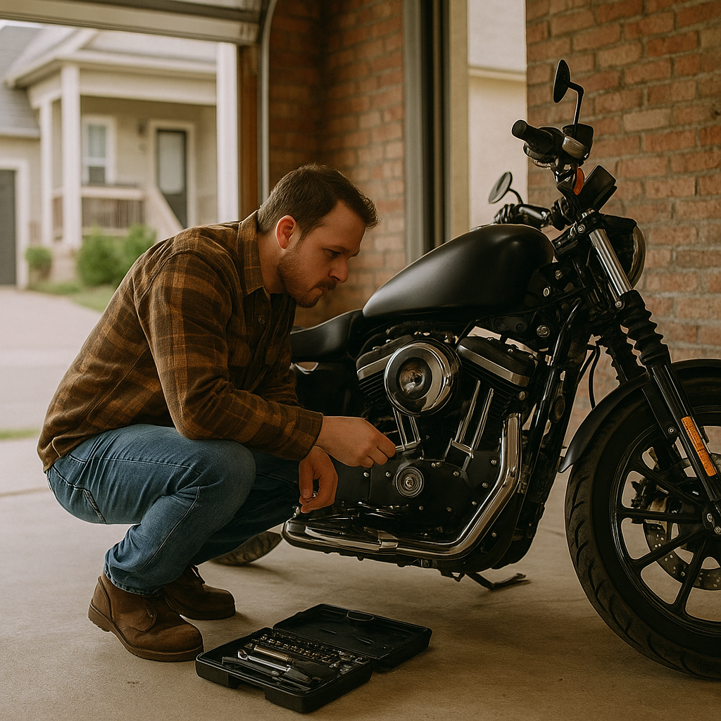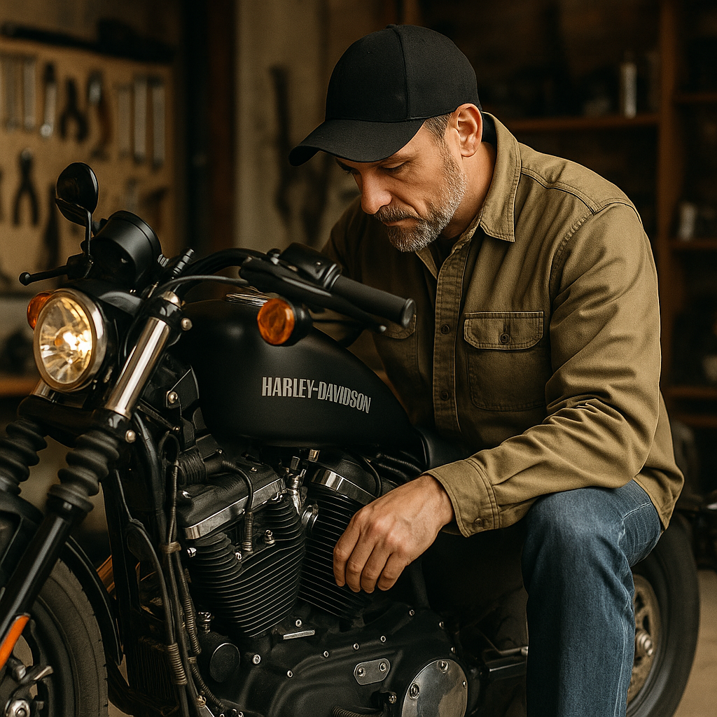 📷 参考イメージ:ガレージでメンテナンス中のハーレーとオーナーの写真