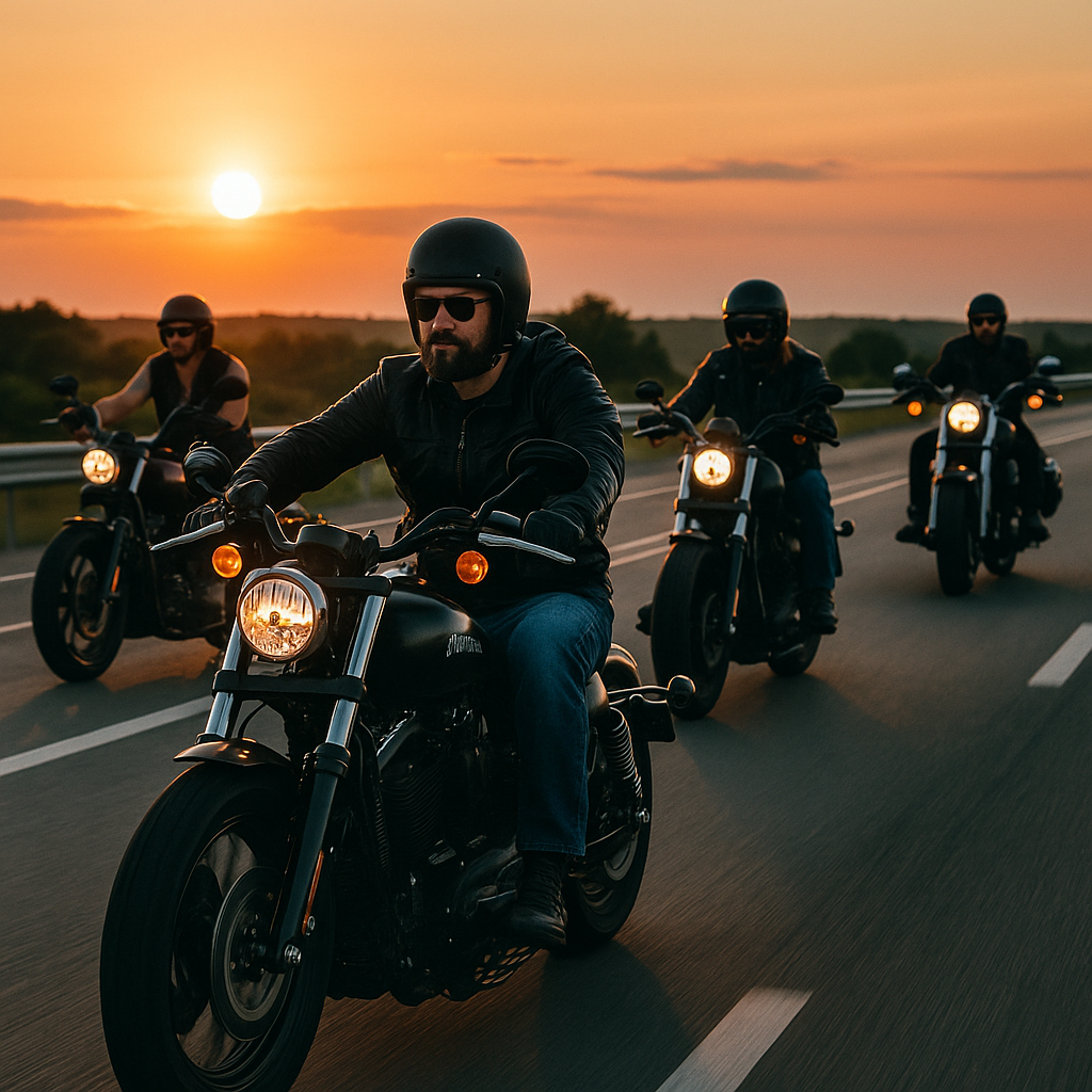 📷 イメージ:仲間とツーリングを楽しむハーレーオーナーたち、夕暮れのハイウェイでのワンシーン