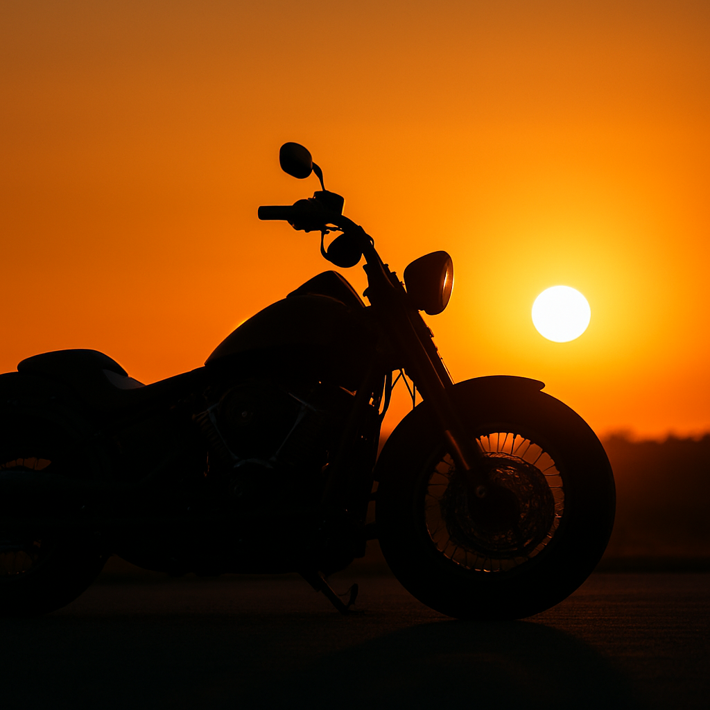 📷 イメージ:夕陽に照らされるハーレーのシルエット