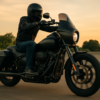 📷 イメージ:夕陽に照らされるハーレーのシルエット