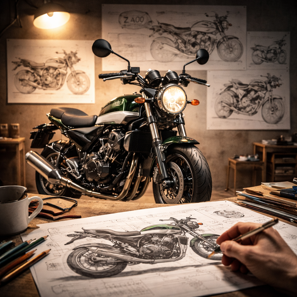 内容としては、Z900RSやZ650RSのデザイン要素を400ccクラスに落とし込んだイメージが多く、丸目ヘッドライトやティアドロップ型タンク、クラシカルなテール周りを想定したビジュアルが主流です。