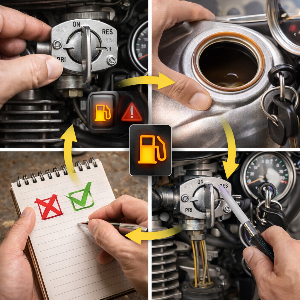 燃料コックの向きトラブルが起きた際は、まず手動式か負圧式かを正しく把握することが最優先です。