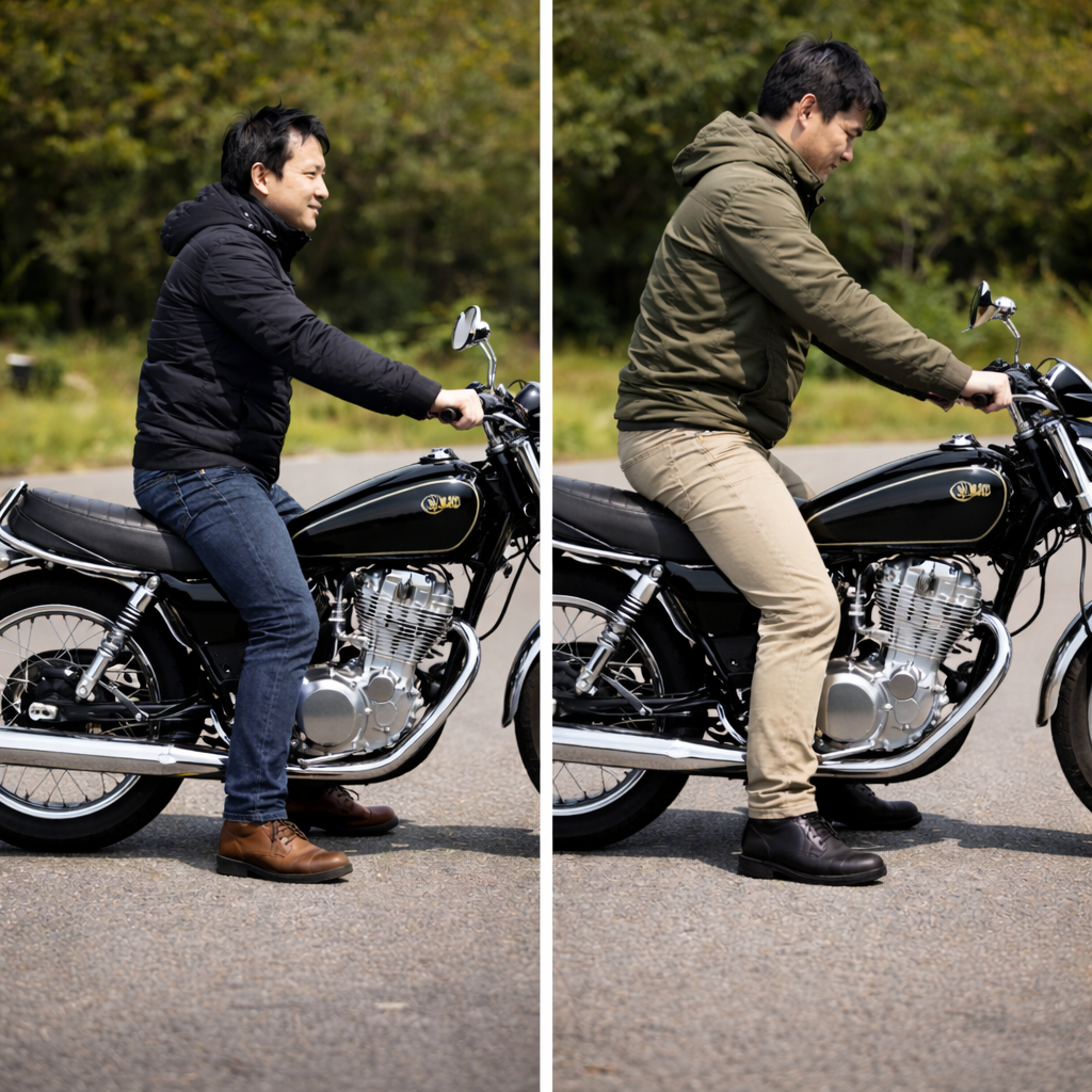 SR400の足つきについて語られる際、「身長◯cmなら大丈夫かどうか」という視点で判断されがちです。しかし実際には、足つきは身長だけで決まるものではありません。