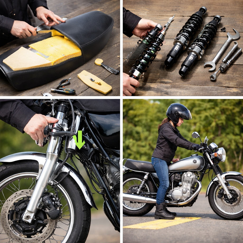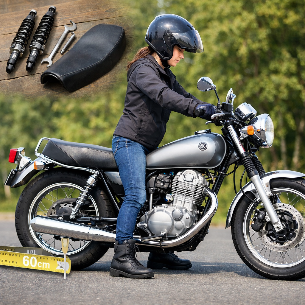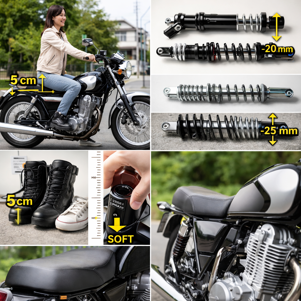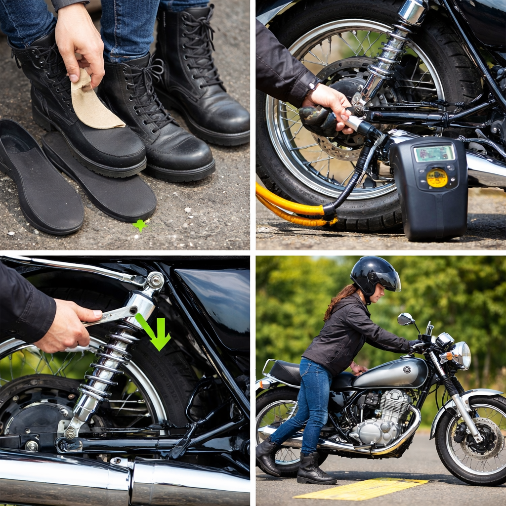 このように、SR400の足つき不安は一つの原因だけでなく、サスペンション、タイヤ、車重、そして乗り方といった複数の要素が重なって生じています。次の章では、これらの原因を踏まえたうえで、工具不要・低コストで試せる足つき改善策から、定番のカスタム方法までを段階的に紹介していきます。