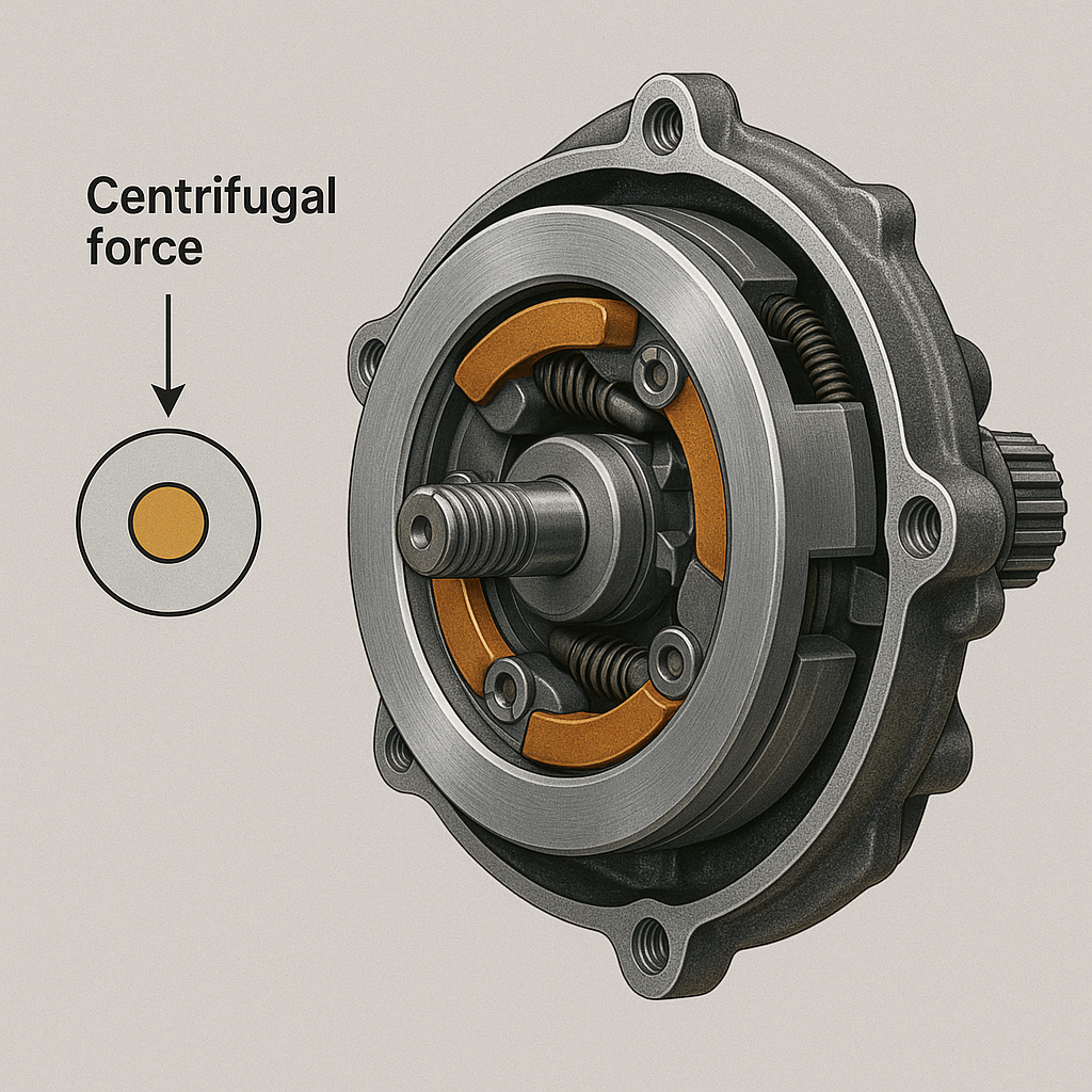 クラッチ内部には「遠心ウェイト」と呼ばれる部品があり、エンジン回転数が上がると遠心力が働いてクラッチを自動的に接続します。