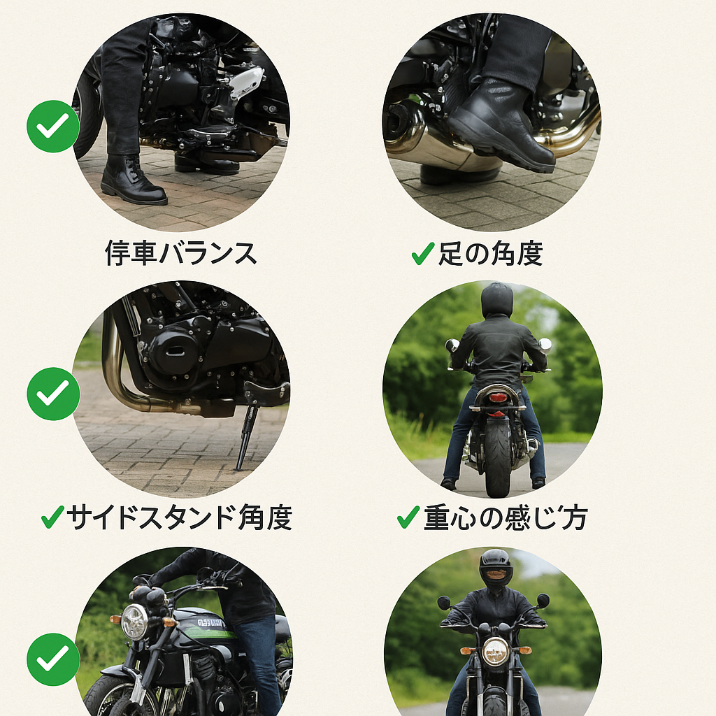 ✓ 停車バランス ✓ 足の角度 ✓ サイドスタンド角度 ✓ 重心の感じ方 ✓ 取り回し時の腕の負担 ✓ 発進姿勢の安定度
